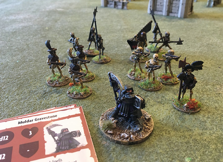 Brain gets skewered by Sir Roderick. But soon attracts the attention of the skeleton crossbows. His armor saves him from certain death, but the Shock piles up. Just in time to be ensorcelled by Gravestone. His accumulated Shock makes makes it hard for him to resist the Necromancer's gaze. He is soon Helpless...