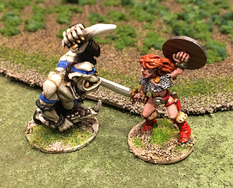 The Orc shaman discards his spells for some hand to hand combat (he has to since he's Bloodthirsty). Red Tonya never had a chance. Her armored bikini was no match for Orc ferocity.