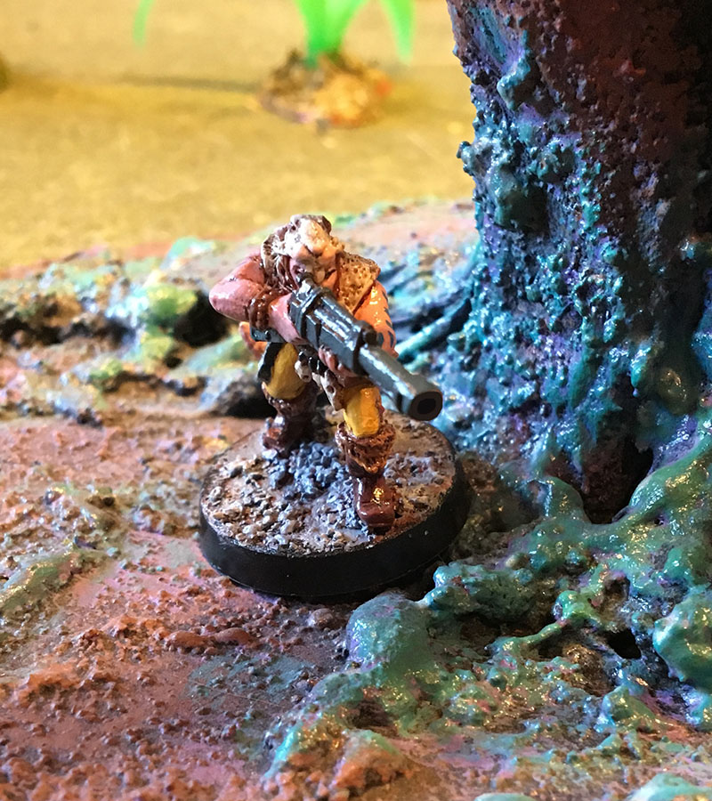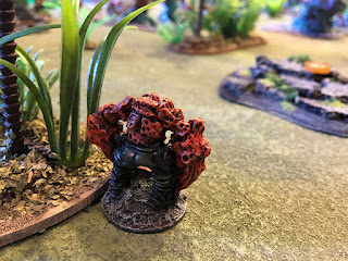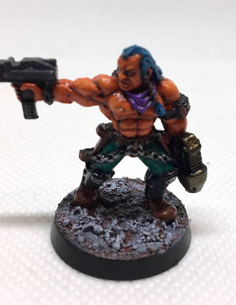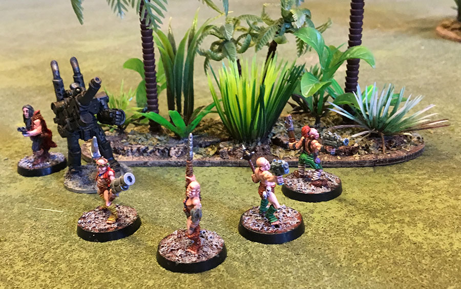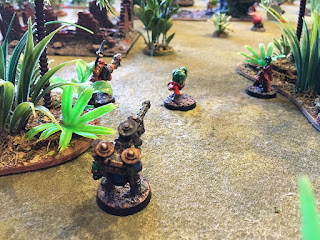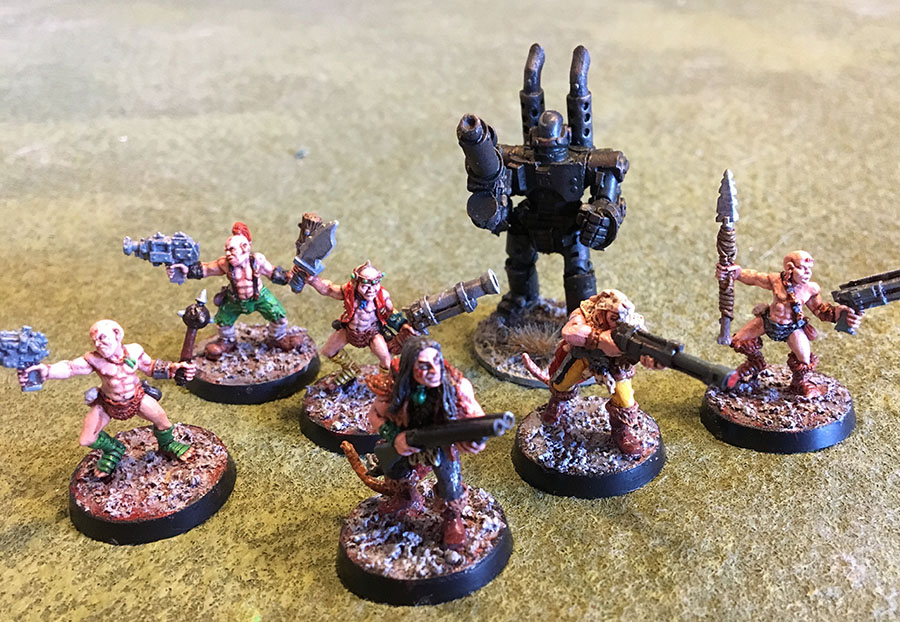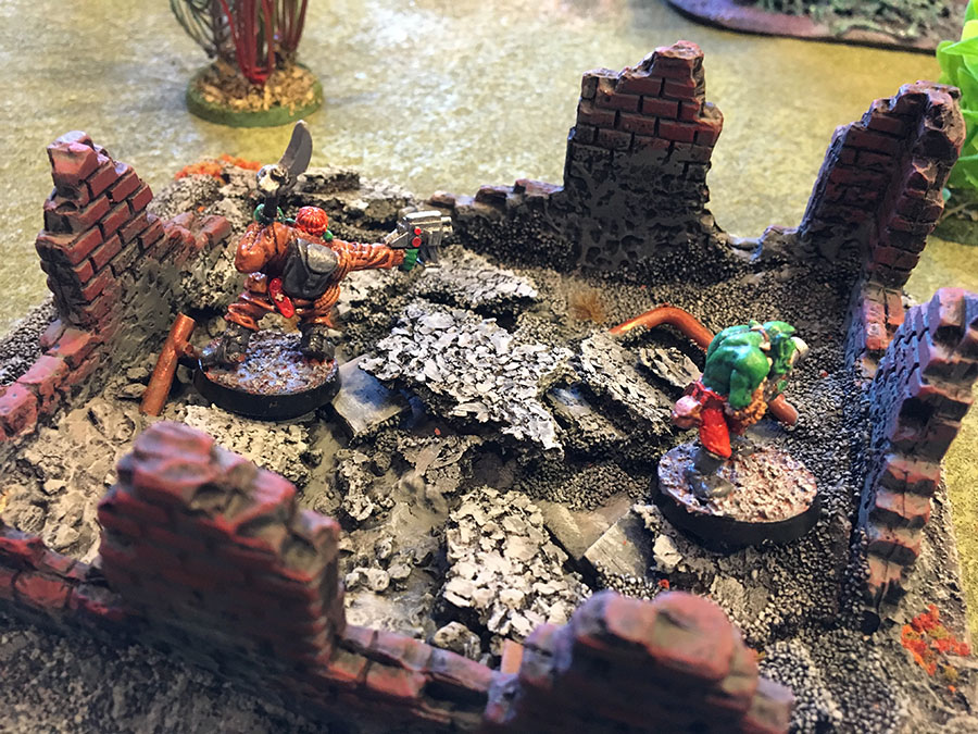 With a six player game there are bound to be fleeting alliances and someone always gets ganged up on. Enter the Ratskin gang. By turn 4 they had been attacked by 4 different gangs and lost all of their younger recruits. The Book of Grudges was heavy with payback.The ancient warbot, GI-88, electronic heart heavy with grief over the young one's deaths, turned his heavy machine gun on everything in range and unleashed hell!