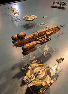So, in a couple of days we put together a fleet action. A group of Rebel commanders were trying to run an Imperial blockade above the water planet Zindo (we had some generously donated space mats, but the playing area ended up being 6' x 8'). The Rebels had to clear the Imperial fighters away for the command ships, while the Imps had to take out at least half the fighter cover so their own capital ships could engage. The command ships really just functioned as clock moving across the table to show when the game was over.