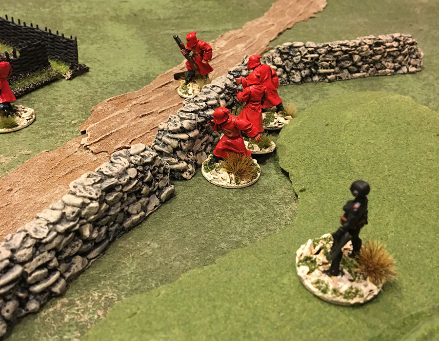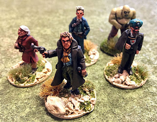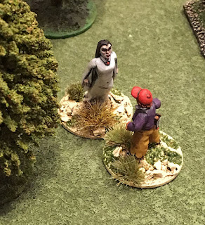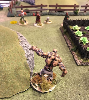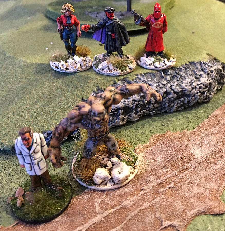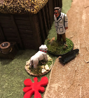 The evening began with a nice "Welcome to the neighborhood" from Von Zombie when he blasted his arch nemesis Dutch Oven with submachine gun fire. The poor old Colonel went down. Dutch's crew responded by chucking a stick of dynamite. This seemed to anger the Monster, who promptly bashed the blighter's head in. "Our Heroes" bravely hiding.