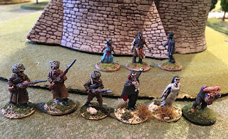 Did I mention, every time a Joker is played, a horde of zombies appears? These would attack the closest living target. Lucky for the Baron, he doesn't suffer from that affliction...The Cult of Cyclops did a number on the heroes moving down this flank. At one point Angus McTubby had 5 Shock markers on him. All it took was Ilsa delivering a coup d' grace.