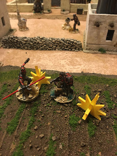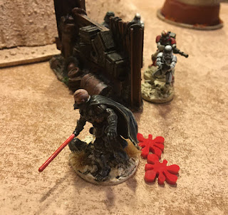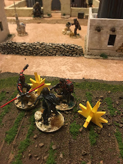 Darth Maul force leaps to the top a building to duel with the Jedi master. Single heroes use their number of wounds as they're dice (in this case each has 3).Vader drew a lot of fire. He managed to send most of it back with lightsaber deflections. But he was finally forced to withdraw. When the number of shock is more than the number miniature, or in this case wounds, the unit retreats.