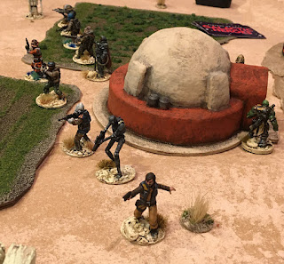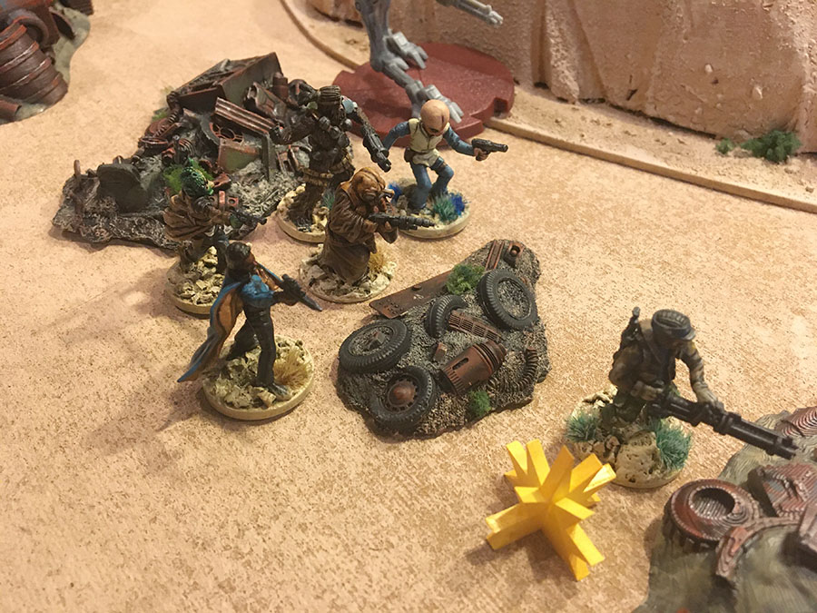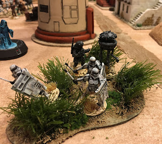 The Imps try to make best use of cover. A Rebel land speeder, outflanked them and poured blaster and missile fire into them.
