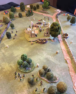 We had 3 German players who set up first. The 4 American players would parachute in by standing a few feet away from the table a tossing a cotton ball at their desired landing point. This lead to a lot of blowing by the Germans. Two players dropped their troops right on top the Germans, while the other two landed in the woods. There was also a box of experimental weapons the paratroopers had to find just in case their weapons couldn't handle whatever the mad doctor had waiting.